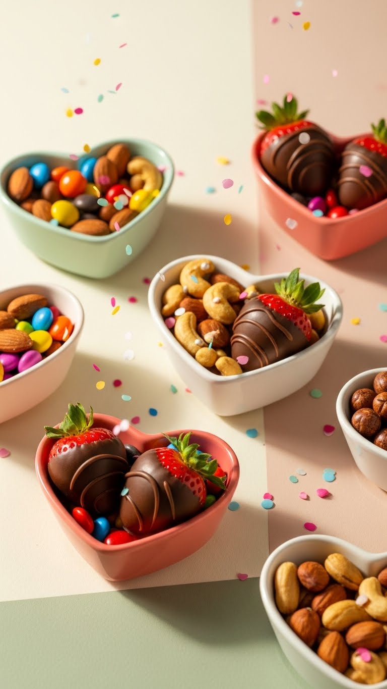 A few simple pieces can turn snacks into a centerpiece: fill small heart-shaped bowls with assorted candies, nuts, or chocolate-dipped strawberries and scatter colorful confetti for an instant playful vibe. You’ll style mini heartbowls in mixed textures and muted palettes, pairing candy confetti accents for movement. Keep proportions airy, let each bowl breathe, and invite guests to graze freely and joyfully.