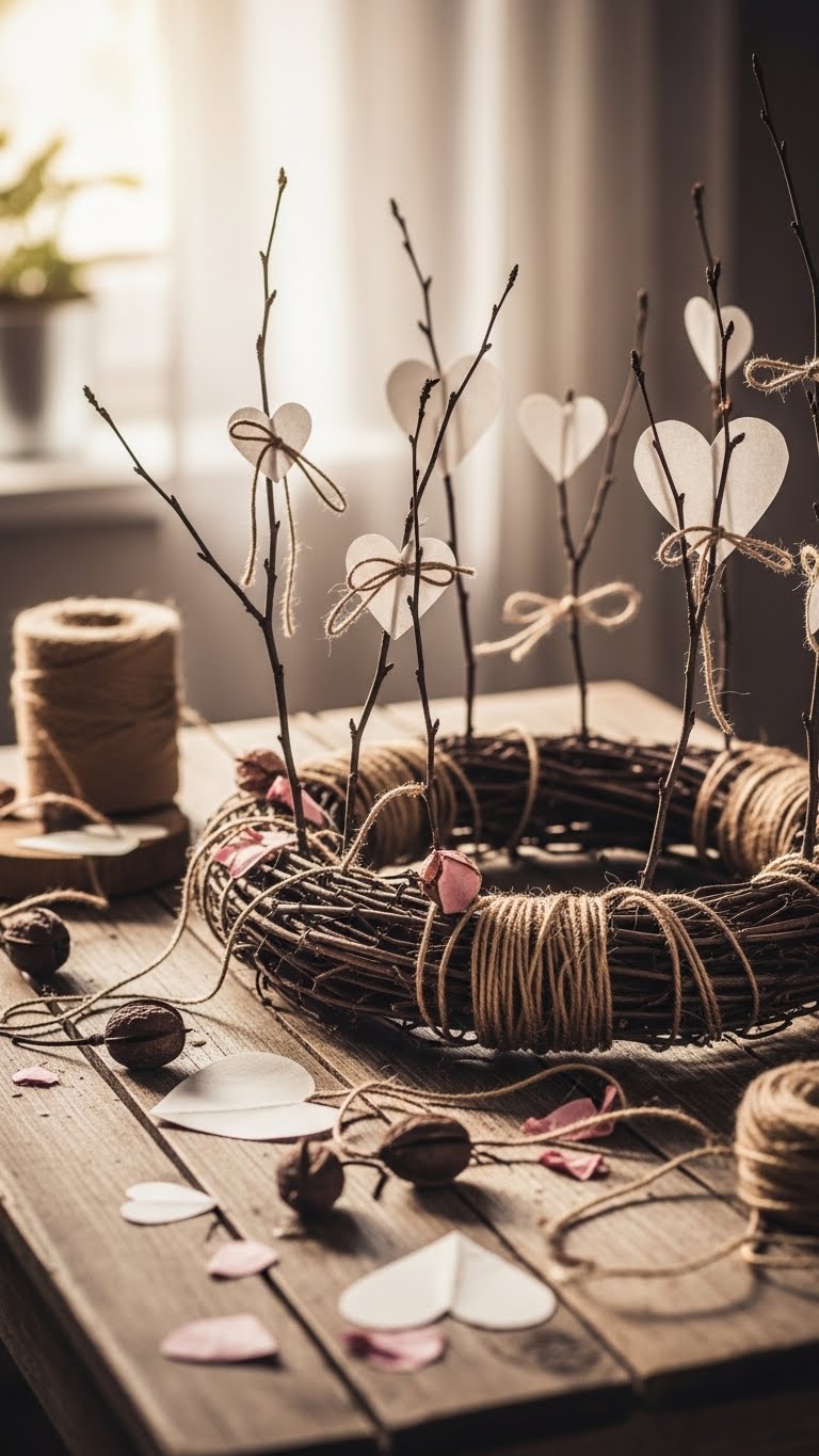 Tied to slender branches, delicate paper hearts bring an easy, rustic charm to your Valentine’s display—mixing handmade texture with clean, modern lines for a look that’s both cozy and curated. You’ll drape twine wrapped garlands in heart clusters, nestling them among a twig wreath and scattered seed pod accents.