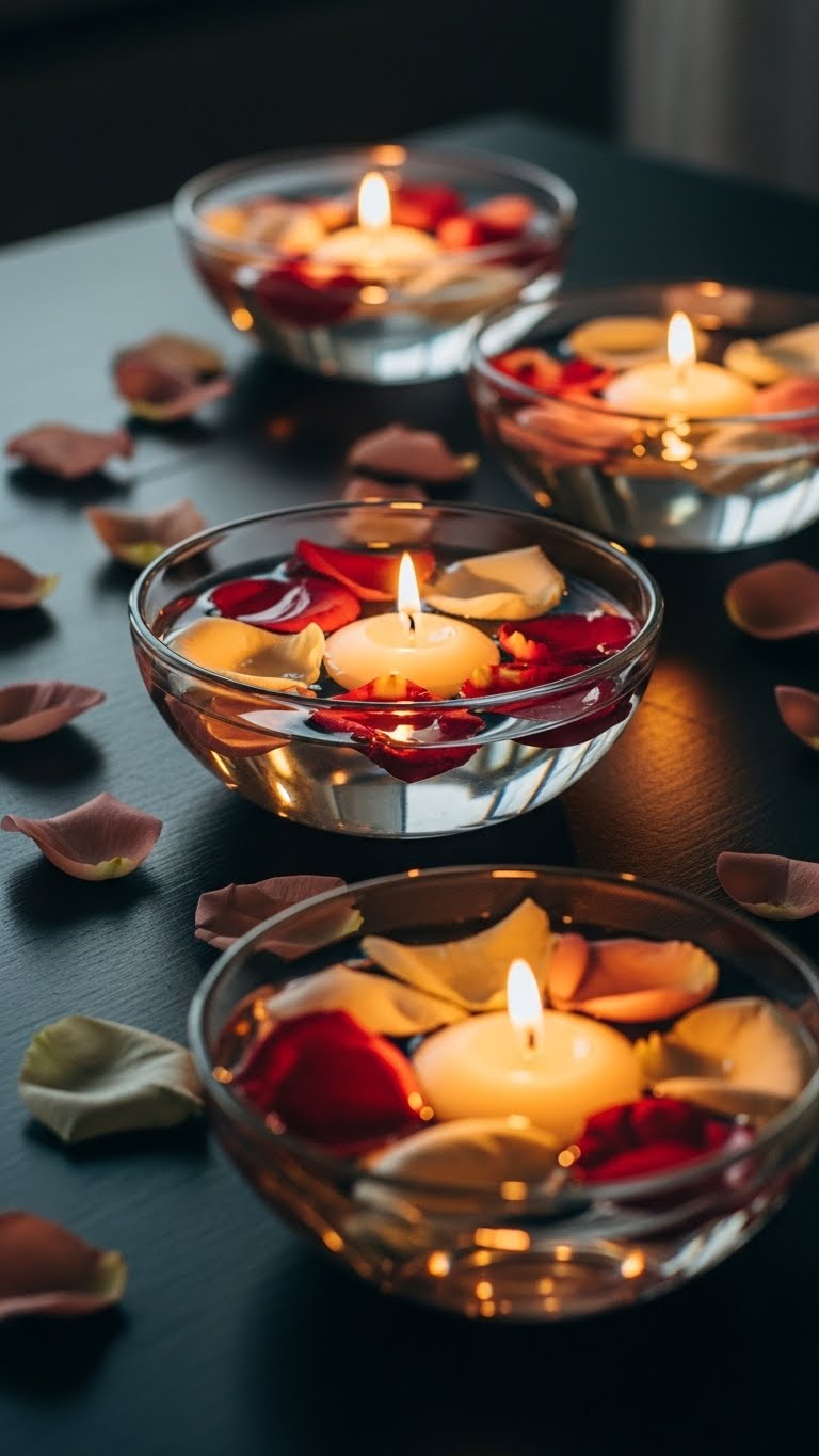 Move from twig-warm textures to liquid light by arranging shallow bowls of water, floating candles, and loose rose petals for a dreamy, low-slung glow. You’ll scatter floating tea lights to create a soft flicker, nestle a rose petal halo around each flame, and let reflections ripple across the table. It feels modern, freeing, and effortlessly intimate—no fuss, just mood.