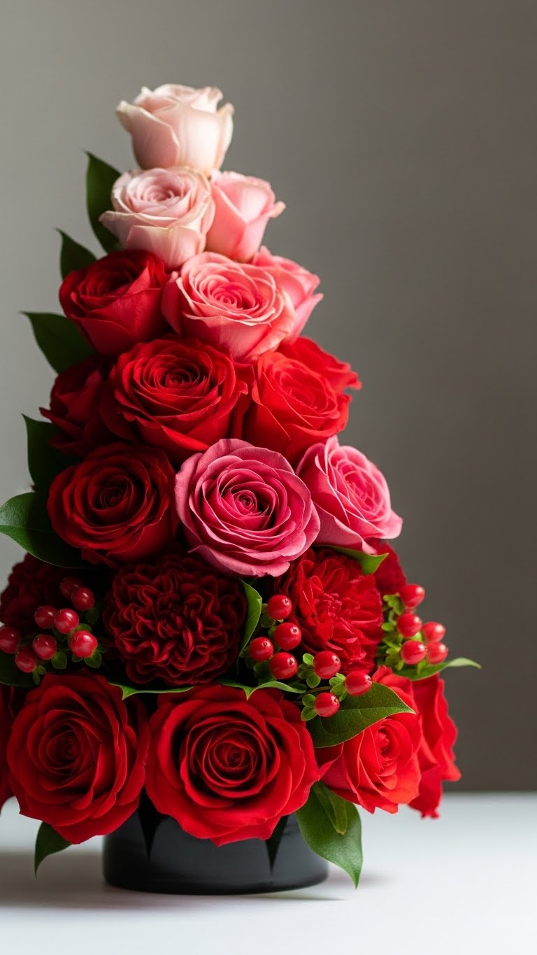 You’ll arrange blooms and foliage in ombre gradients, moving from scarlet to blush, and mix crimson textures—velvet petals, glossy berries, matte leaves—for depth.