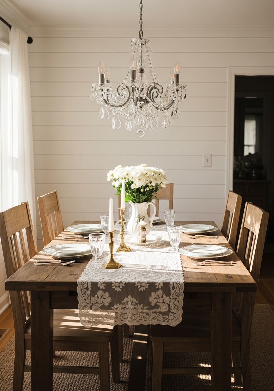 Hanging a vintage chandelier above your dining table instantly adds Victorian flair to farmhouse meals. Mix it with simple wooden chairs for balance. My dining area felt so much more refined after this swap – great for family dinners or just everyday elegance.