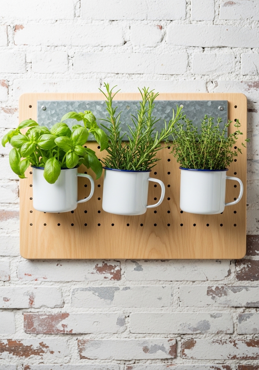 Creating a vertical herb garden using thrifted mugs and a pegboard is a fresh take on budget vintage farmhouse decor for your kitchen. I set one up last spring, and it’s been amazing for snipping fresh basil right there – no fancy planters needed. It brings in greenery and that old-timey utility vibe, plus it’s super space-saving.