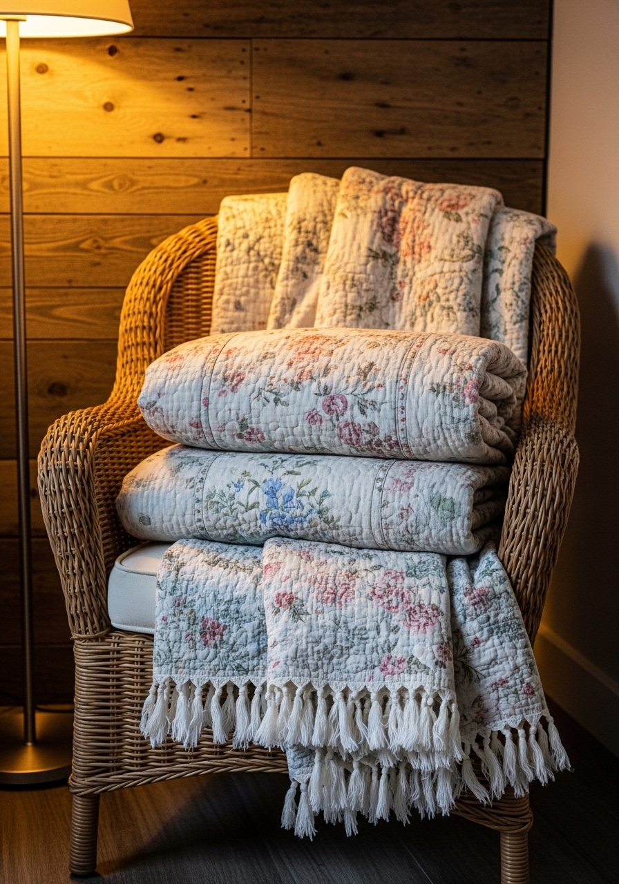 Draping thrifted vintage quilts and throws over furniture is an easy way to add texture and warmth to your farmhouse space on a budget. I collected a few mismatched ones over time, and piling them on my couch creates that inviting, layered look. It’s perfect for chilly nights, and each piece tells its own story without costing a fortune.