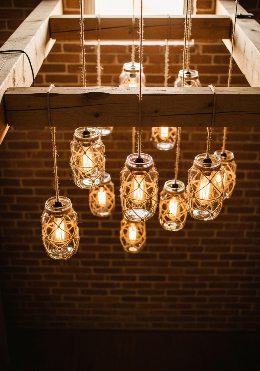 DIYing a chandelier from mason jars and string lights brings vintage farmhouse lighting to your dining area without the expense. I wired mine with affordable bulbs and hung it over my table – creates the coziest ambiance for dinners. It’s customizable, and the soft glow makes everything feel magical on a shoestring budget.