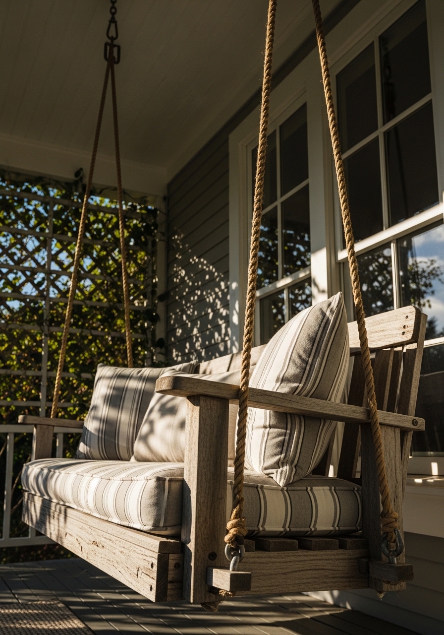 Turning an old swing into porch decor is ideal for extending your vintage farmhouse style outdoors cheaply. I refinished one from a neighbor’s giveaway, added pillows from remnant fabric, and now it’s my favorite reading spot. It adds that nostalgic charm to your exterior, perfect for lazy afternoons.