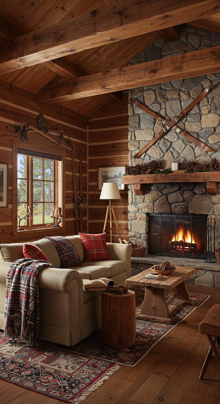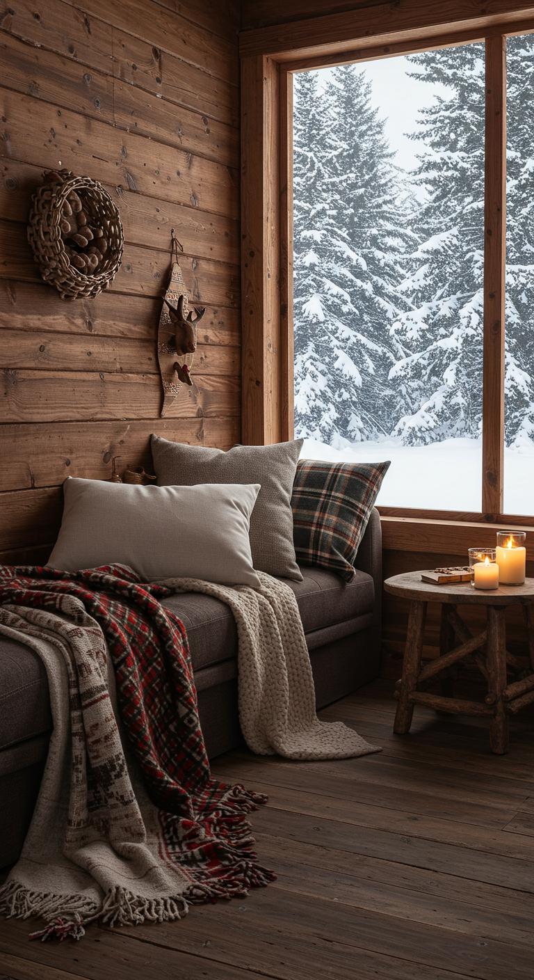 Embrace cabin-inspired textiles like plaid throws and soft woolen blankets, creating warmth and comfort.