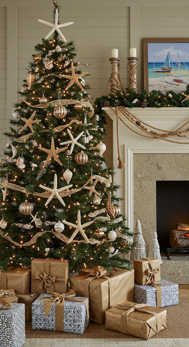 Adorn your tree with beachy ornaments like starfish and seashells, creating a whimsical touch.