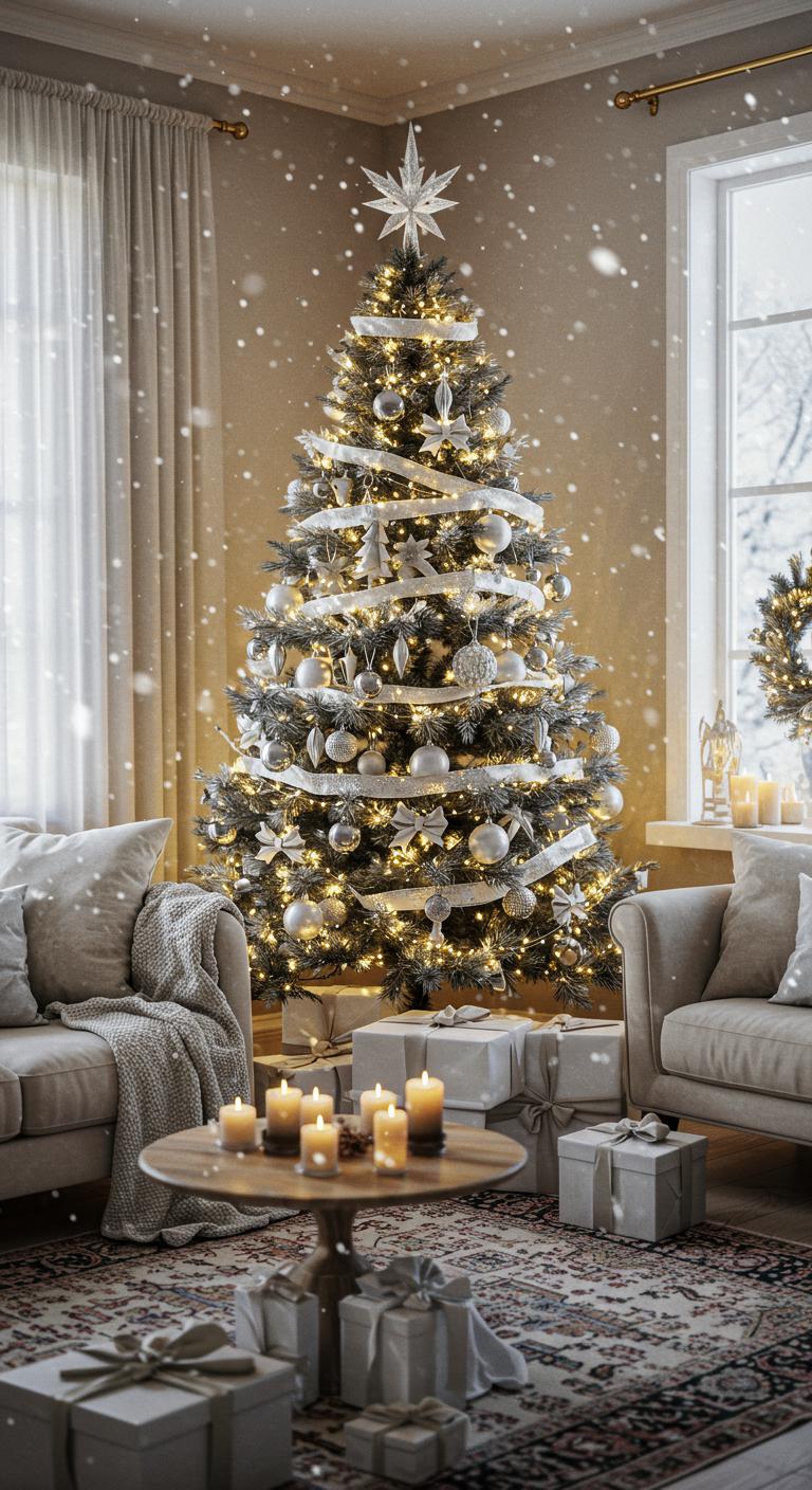 Embrace whites, silvers, and icy blues to create a serene, enchanting atmosphere that invites warmth and joy.