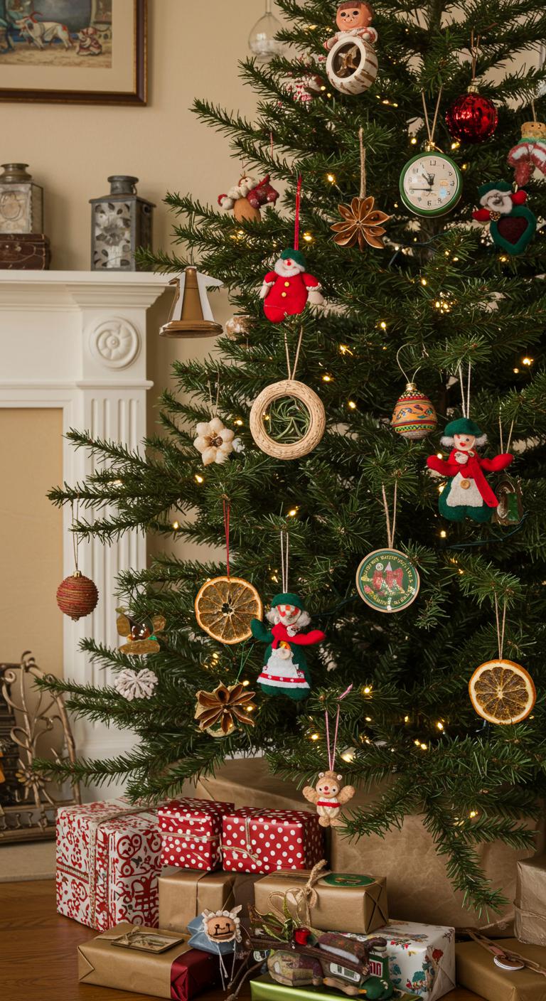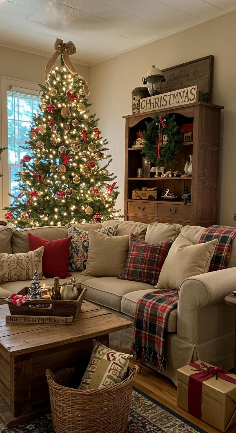 Adorn your space with vintage ornaments that tell stories and cozy up with rustic textiles like plaid throws and burlap accents.