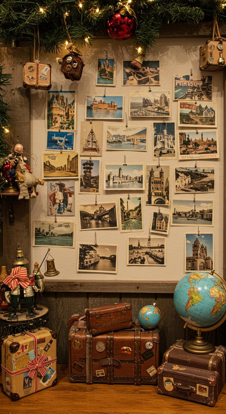 Embracing the charm of vintage travel postcards can transform your holiday decor into a nostalgic journey through time. Create enchanting vintage postcard displays that evoke memories of adventures past. Pair these with travel-themed ornaments, like miniature suitcases or globes, to enhance the theme. This unique blend invites warmth and wanderlust, making your space feel inviting and free-spirited, perfect for celebrating the season.