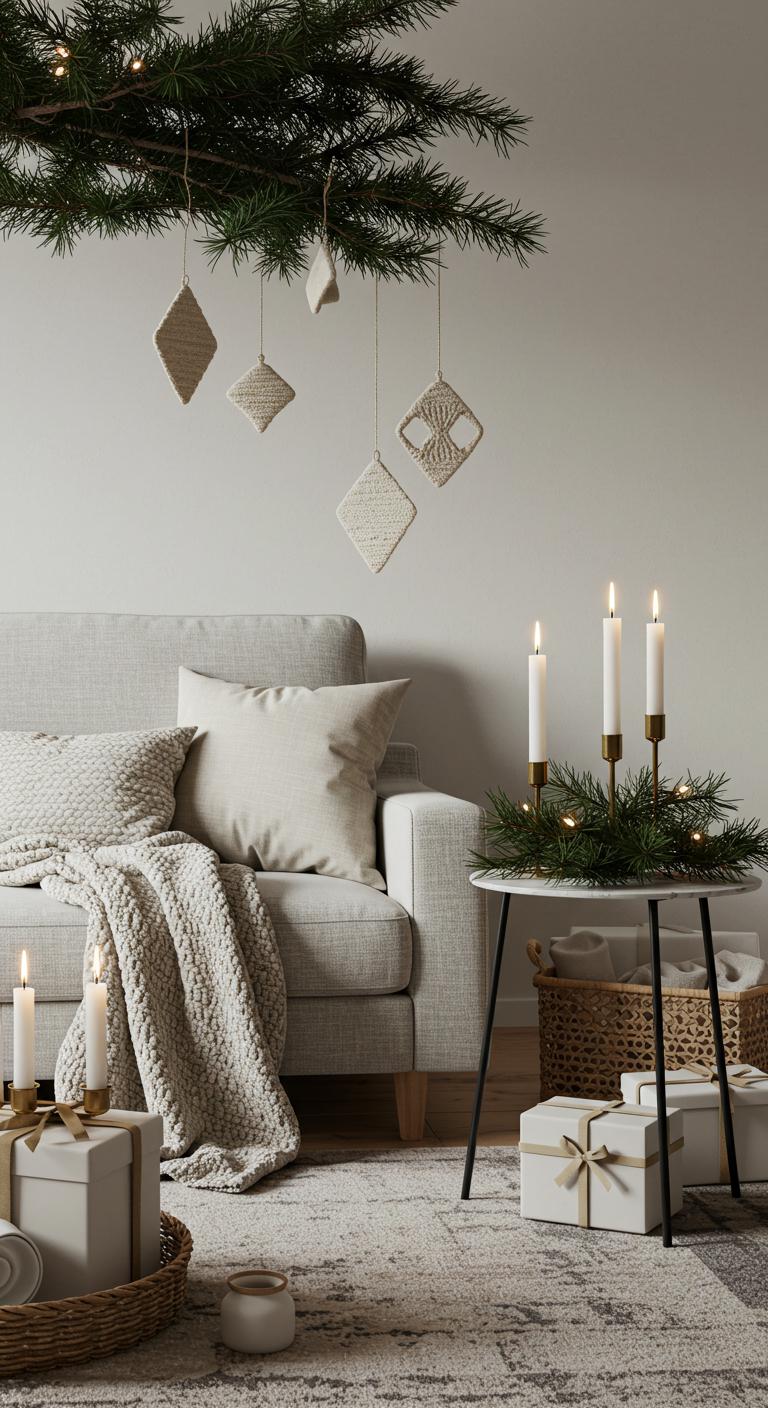 Focus on neutral palettes and clean lines, allowing Scandinavian simplicity to shine through. Incorporate cozy Nordic textiles, like soft throws and handwoven ornaments, to create warmth.