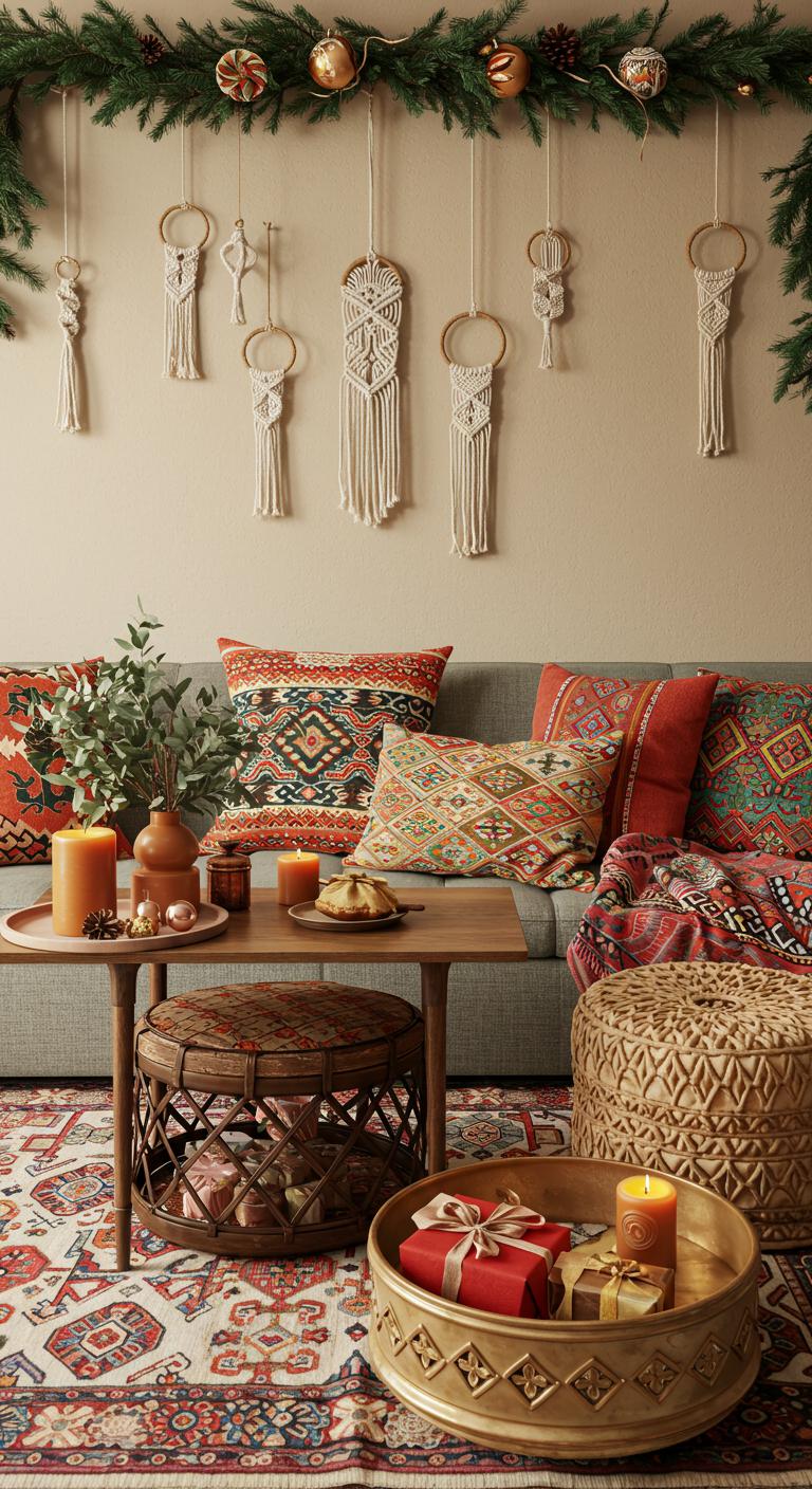 Embrace earthy tones in your decorations, mixing textures and patterns freely. Adorn your space with macrame ornaments that add a handmade touch, while layering in colorful textiles.