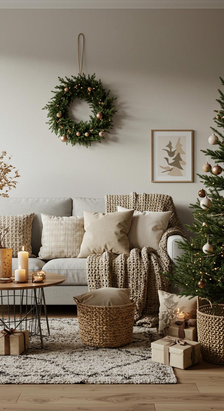 Accentuate these elements with natural textures, such as woven baskets and wooden ornaments, creating a harmonious space that feels both stylish and effortlessly comfortable this Christmas.