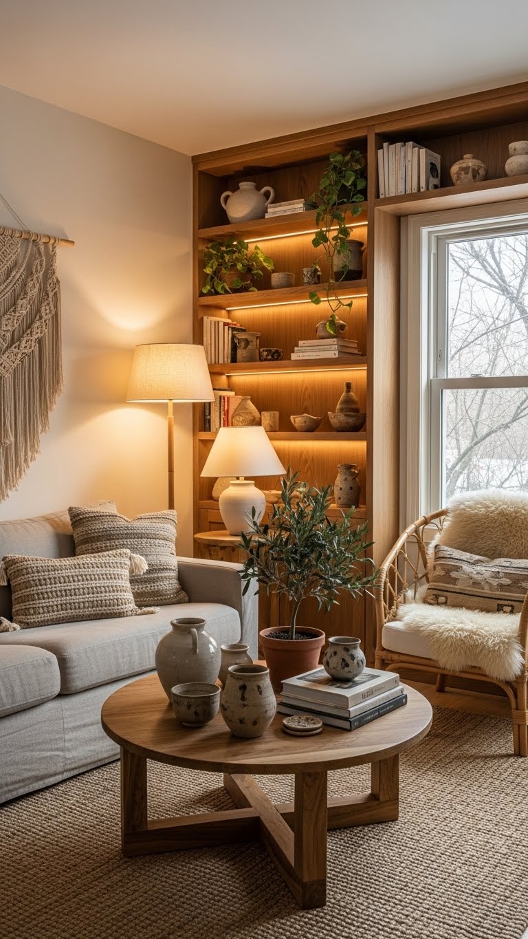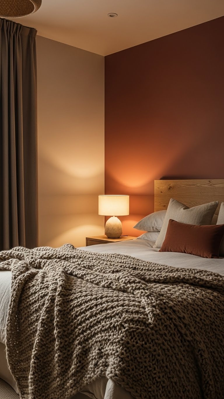 Picture this: Start with walls in beige or caramel for that instant cozy feel. Grab a few sample paints from the hardware store and test them in natural light. Add a simple floor lamp with warm bulbs to tie it together. Break it down: First, paint one wall to see the effect. Then, place the lamp nearby. This combo makes rooms feel hugged in warmth. For budget tips, hit up discount stores for affordable paint and second-hand lamps under $20. DIY hack: Use painter’s tape to create patterns with your neutrals. Keep lights dim with a basic switch—easy to install in minutes. Mix in terracotta accents like a vase for extra pop. These setups work wonders on dark days. End result: A space that invites you to relax. Try it next weekend and notice the shift.