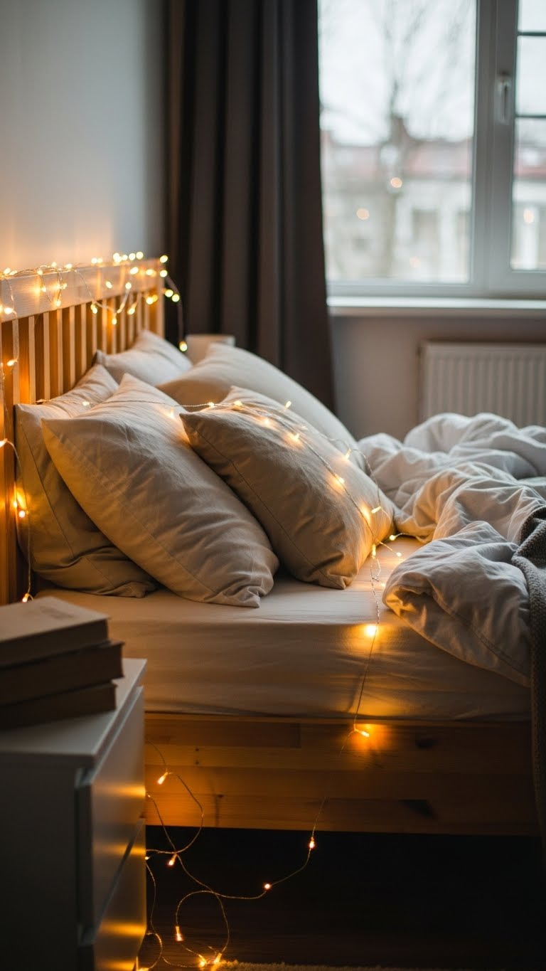 String lights with warm bulbs create instant intimacy. Drape them over your bed or shelves for a quick glow. Pick a set for $10 at big box stores. Start by plugging them in and testing the warmth. Arrange along walls or furniture edges. This makes any room feel magical. Budget idea: Buy battery-operated ones to avoid wiring hassles. DIY example: Wrap them around a headboard with tape for a custom look. Use them in place of bright lights at night. See how it softens the space. Do this in minutes and enjoy the change.