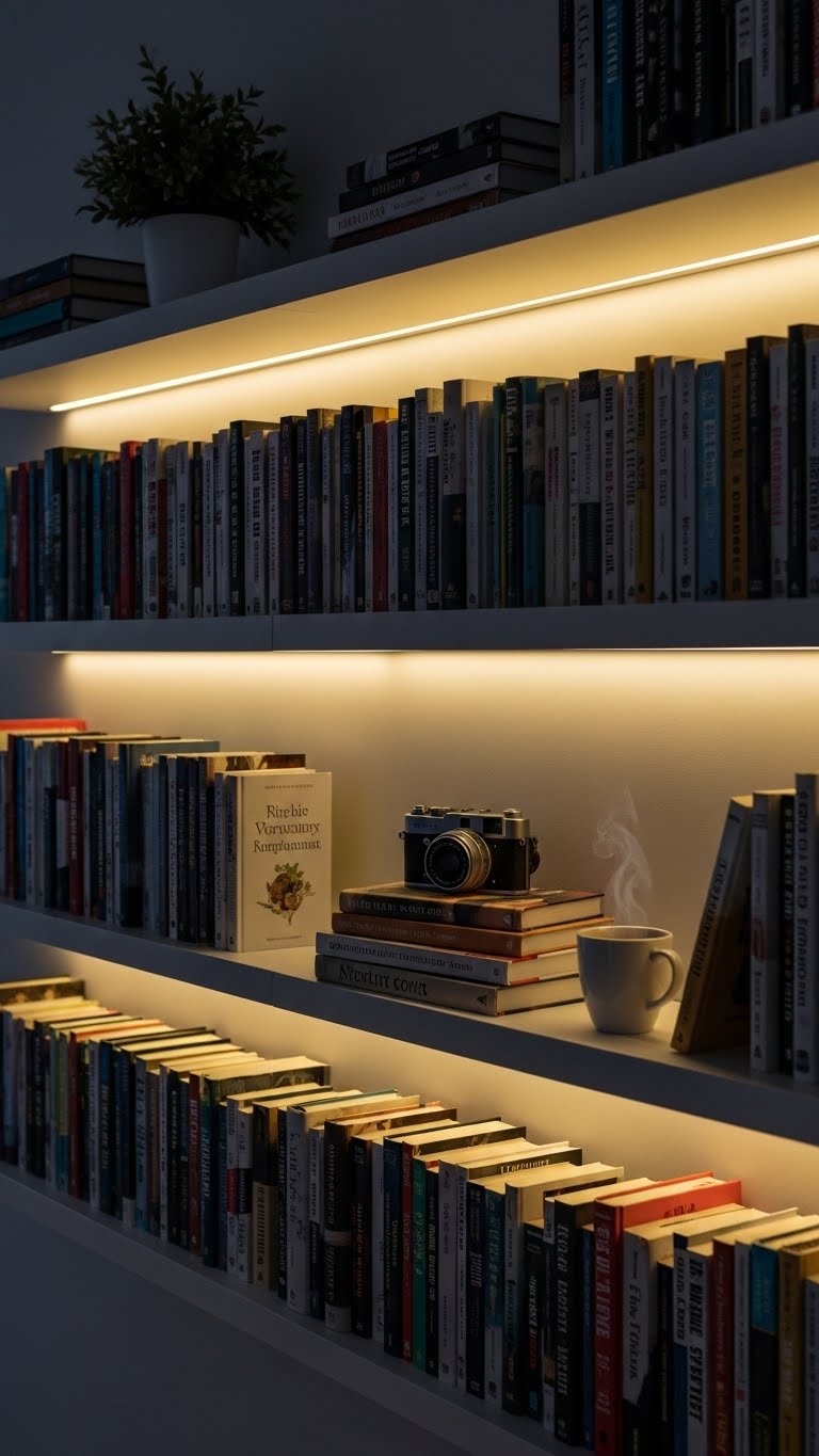 Under-shelf lights make displays pop. Stick LED strips under your shelves for a hidden glow. Buy strips for $8 online. Attach them with adhesive backs. This highlights your items neatly. Budget hack: Use phone-controlled ones for fun. DIY step: Measure shelves first, then plug in. Turn them on for reading spots. It’s a simple upgrade.