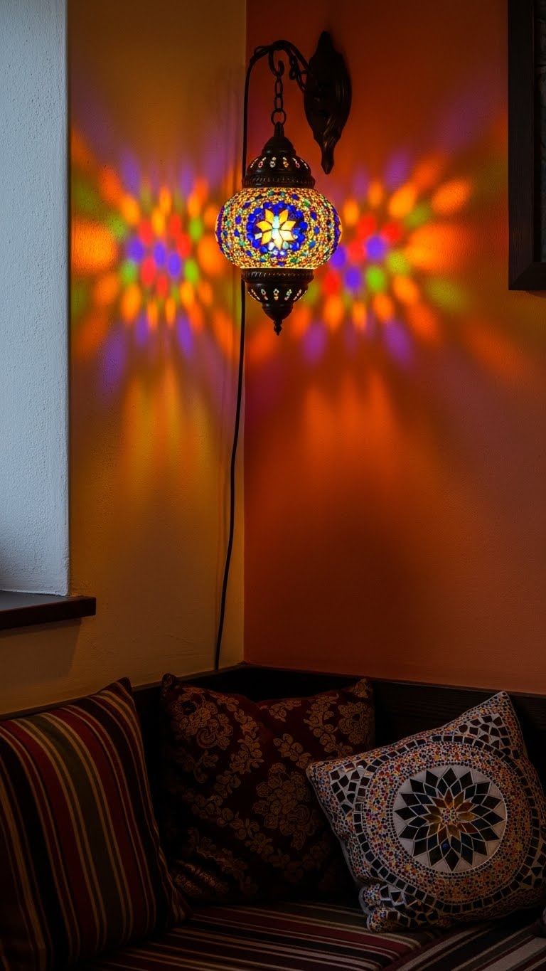 Mosaic lamps throw colorful light around. Set one on a floor for patterns. Buy for $25 online. Plug it in and watch. This livens up spaces. DIY: Place on rugs for ground effects. Turn on for gatherings.