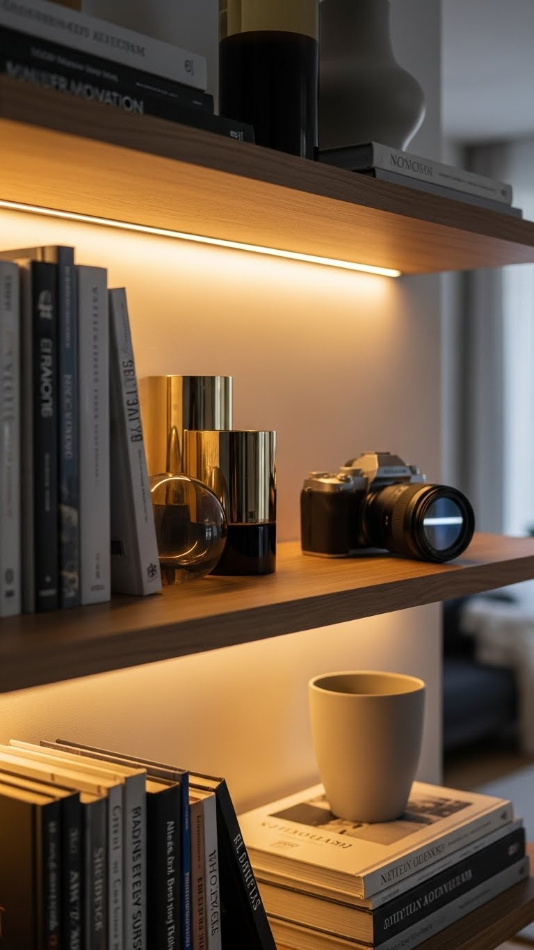 LED strips on edges add modern warmth. Line shelves with them. Purchase for $6. Stick on quickly. This highlights features. DIY: Connect to power.