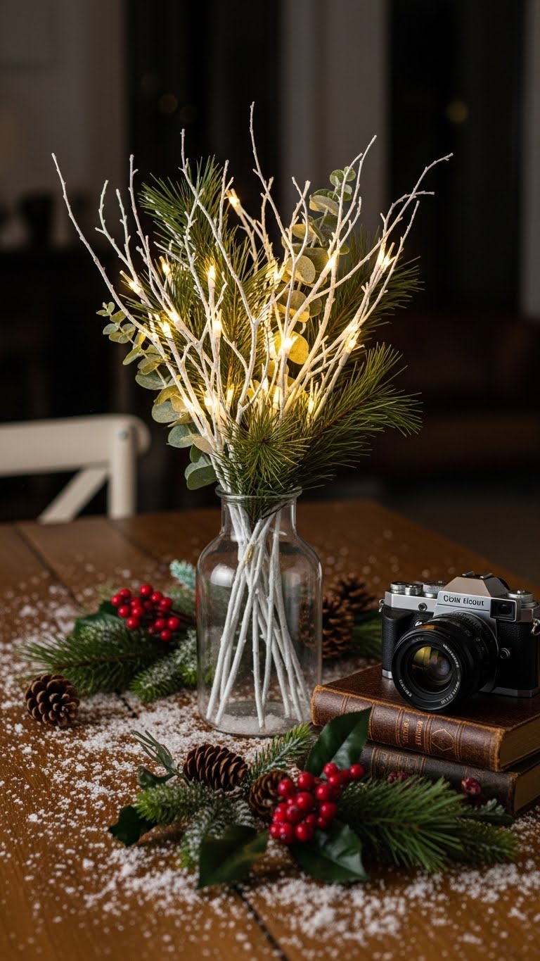 Pre-lit twigs in vases offer radiance. Put in corners. Find for $15. Plug in easily. This brightens spots. DIY: Change vases seasonally.