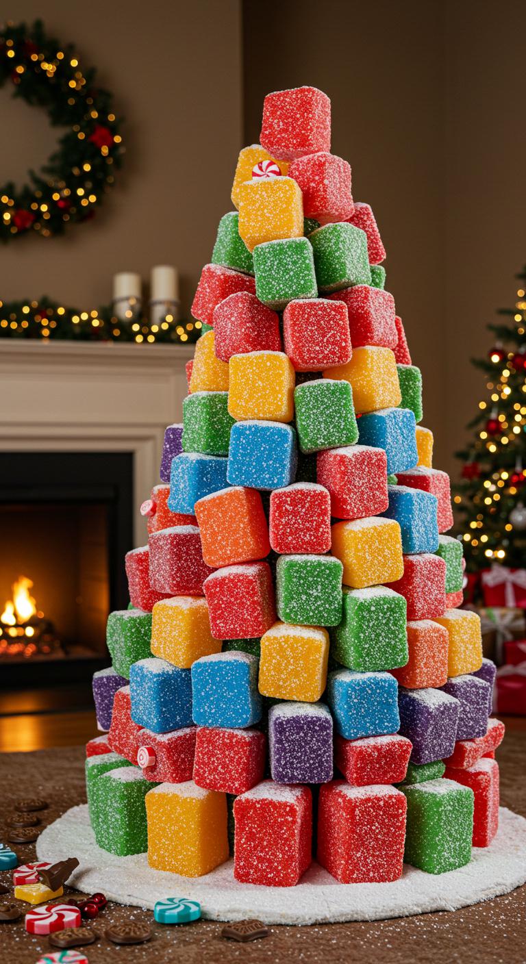 Imagine a towering cone of color sitting by your fireplace—this giant gumdrop tree with glitter snow turns a room into a sweet, whimsical scene.