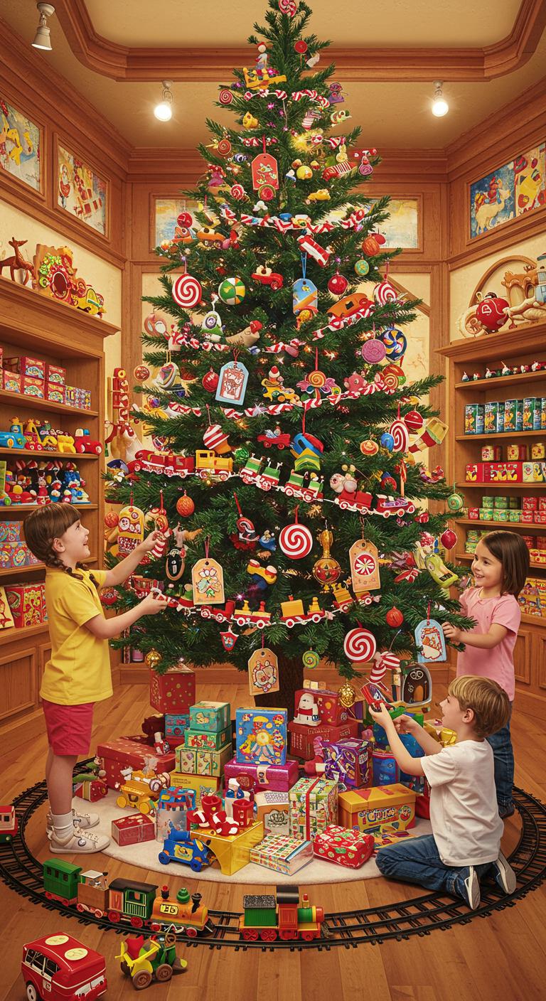 Because kids love hands-on play, the Toy Shop Candyland Tree turns decorating into an imaginative storefront where every branch holds a tiny surprise—miniature toys, candy-themed playsets, and bright, shoppable-looking tags.