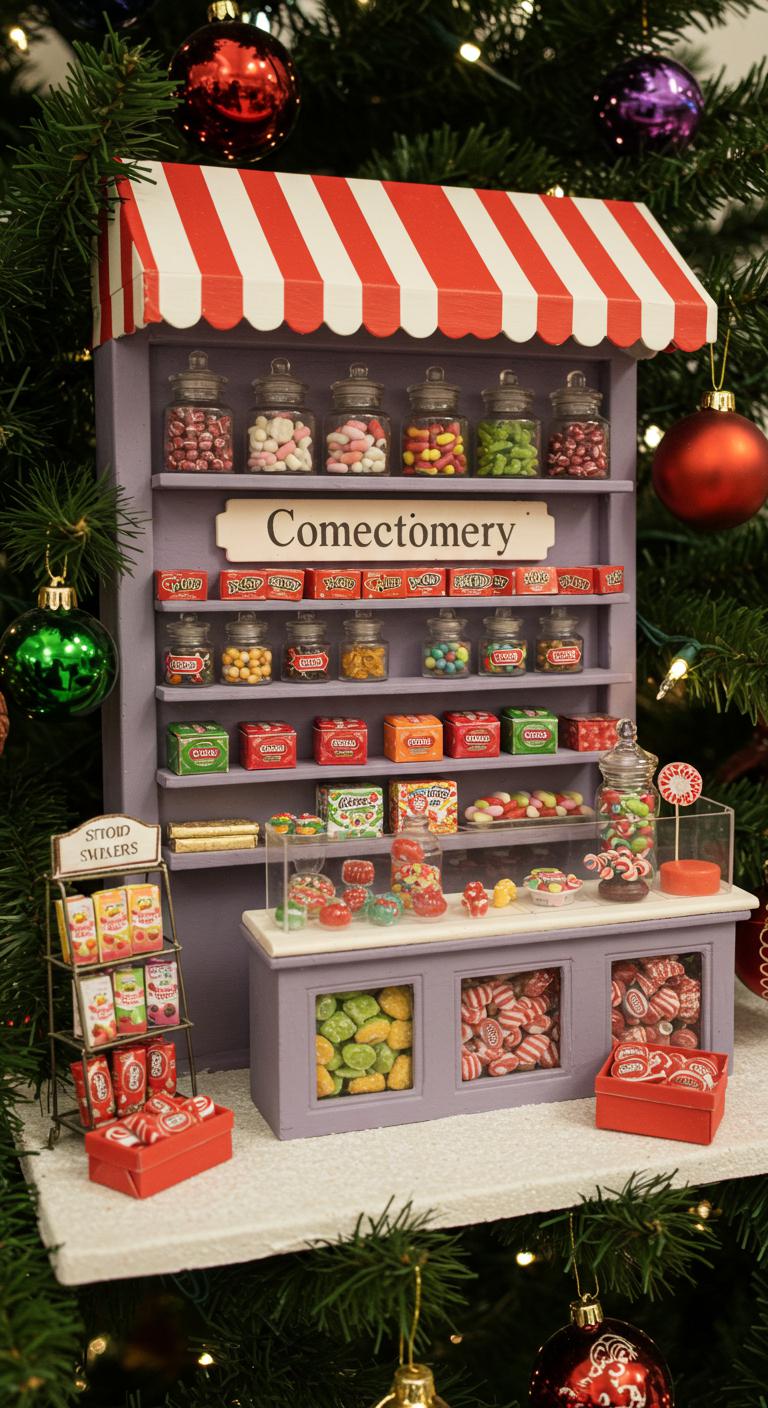 Picture a mini confectionery storefront on your tree, where striped awnings, faux glass jars, and tiny boxed sweets turn branches into a charming display you’ll want to step into.