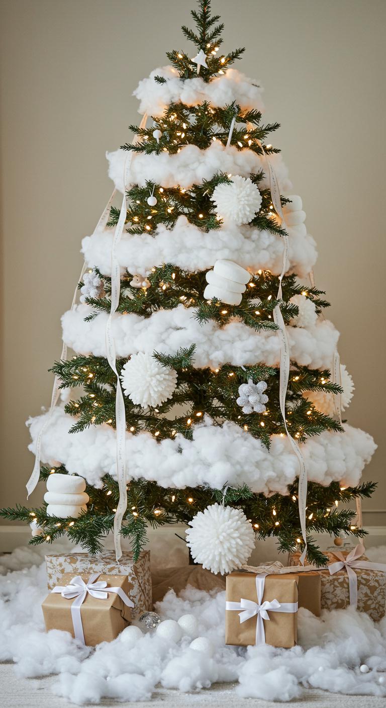 Because the Marshmallow Puff Snowball Tree blends cozy nostalgia with modern whimsy, you’ll create a soft, cloud-like centerpiece by layering oversized faux marshmallows, fluffy pom-poms, and cottony batting across branches to mimic fresh snow.
