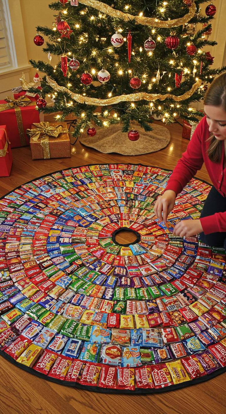 A colorful Candy Wrapper Mosaic Tree Skirt gives you a chance to turn every shiny wrapper into a little piece of holiday art; you’ll cut, overlap, and glue wrappers into a patchwork circle that’s as sturdy as it’s sparkly.