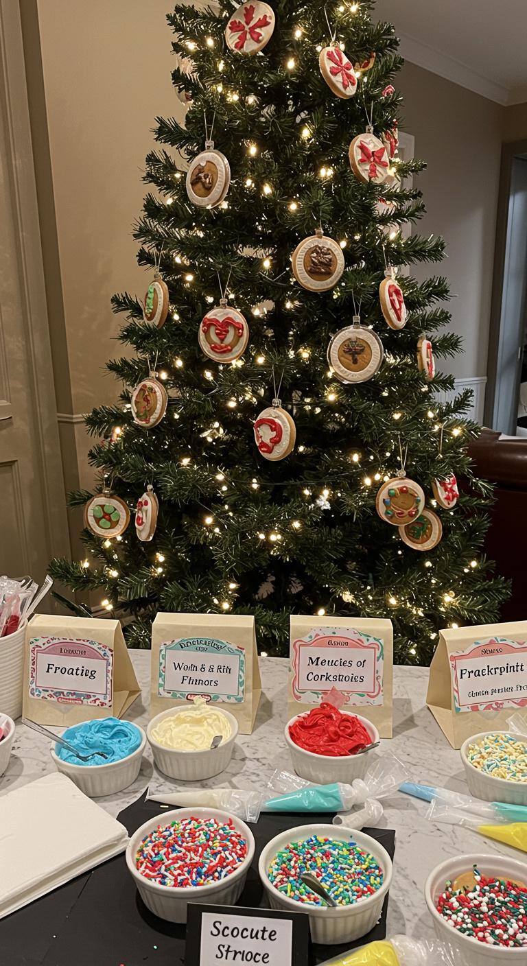 You’ll hang sealed cookie ornaments, set stations for cookie decoration techniques, and label frosting flavor variations so guests choose freely.