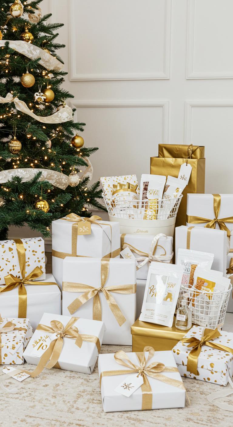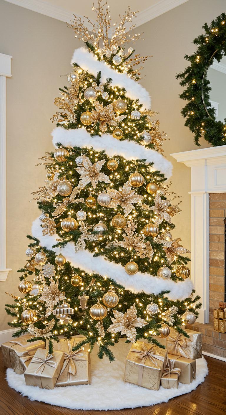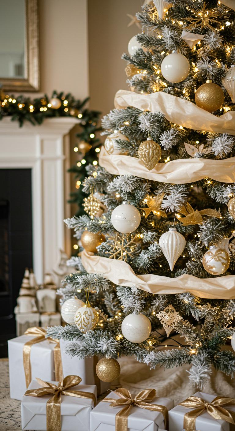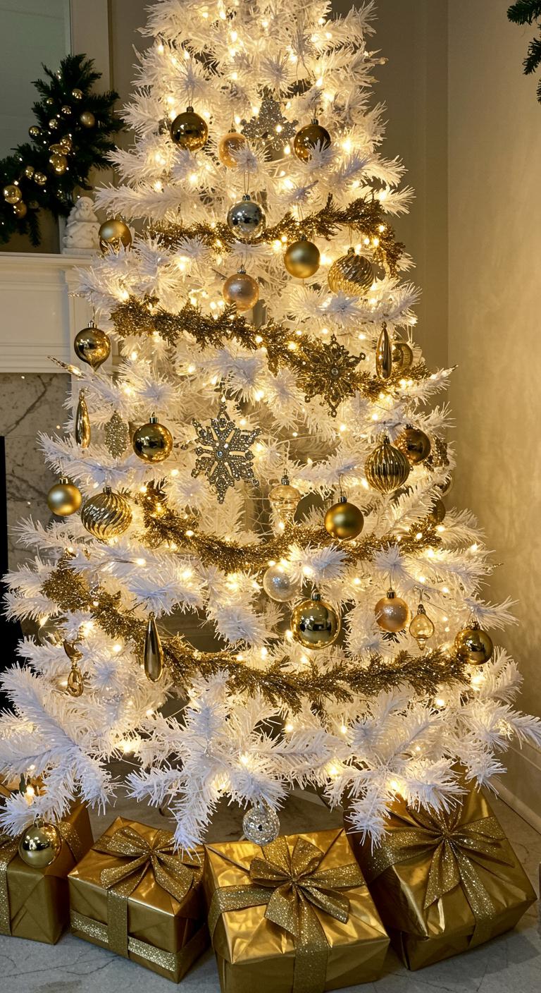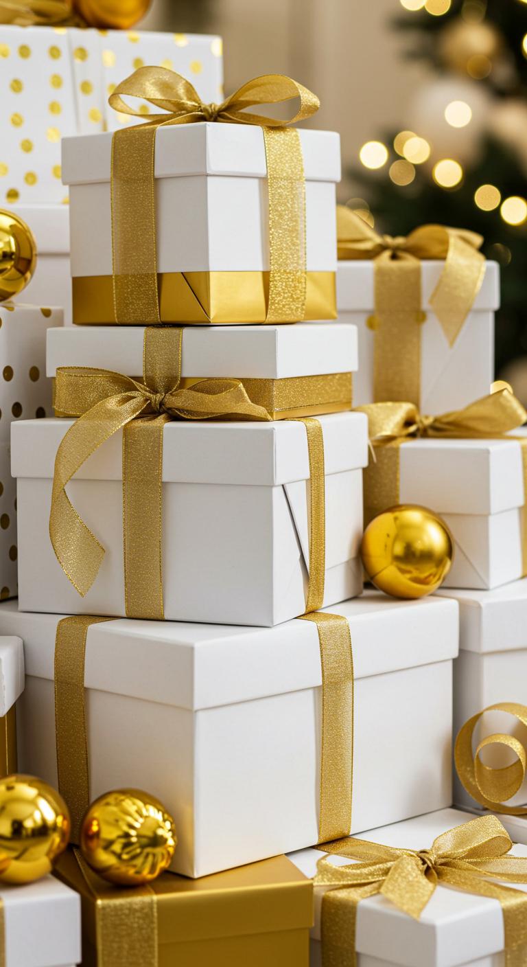 Transform your holiday experience by incorporating white and gold themed gifts under the tree, creating a stunning visual harmony that complements your festive decor.
