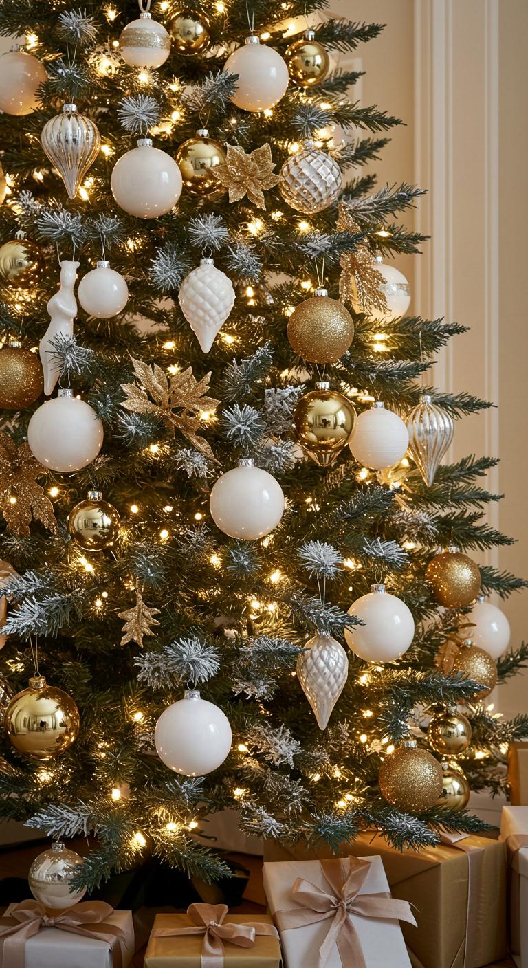 Pair them with delicate gold accents, like shimmering ribbons or golden ornaments, to create a striking contrast that radiates elegance, transforming your tree into a mesmerizing centerpiece of holiday glamour.