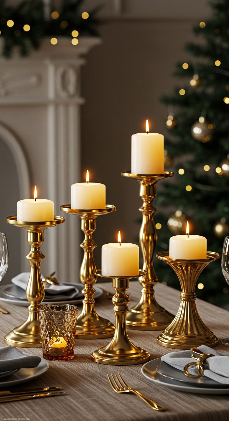 Five elegant gold candle holders can transform your white and gold Christmas tree display into a stunning focal point.