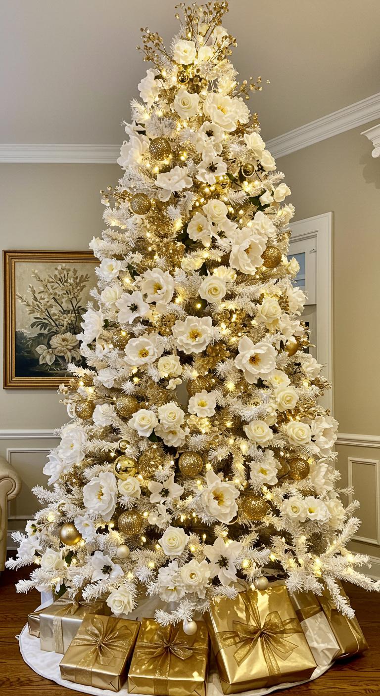 Delicate white floral accents can bring a touch of ethereal beauty to your white and gold Christmas tree display.