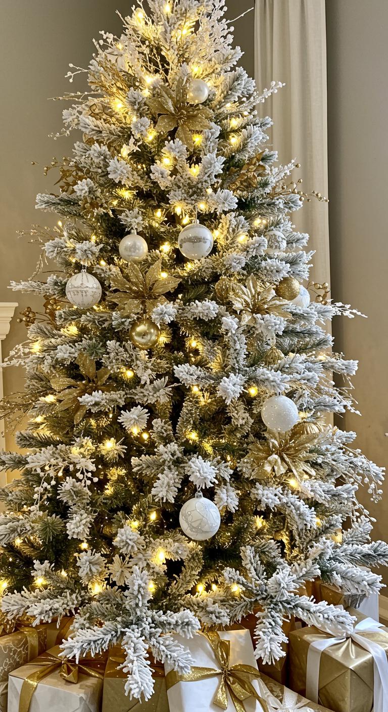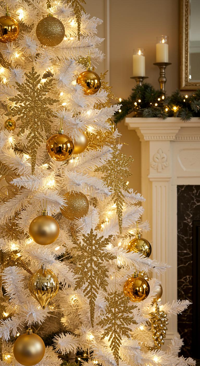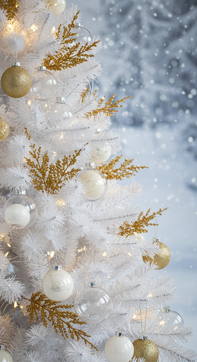 Textured white and gold foliage transforms your Christmas tree into a stunning centerpiece that captures the essence of winter elegance.