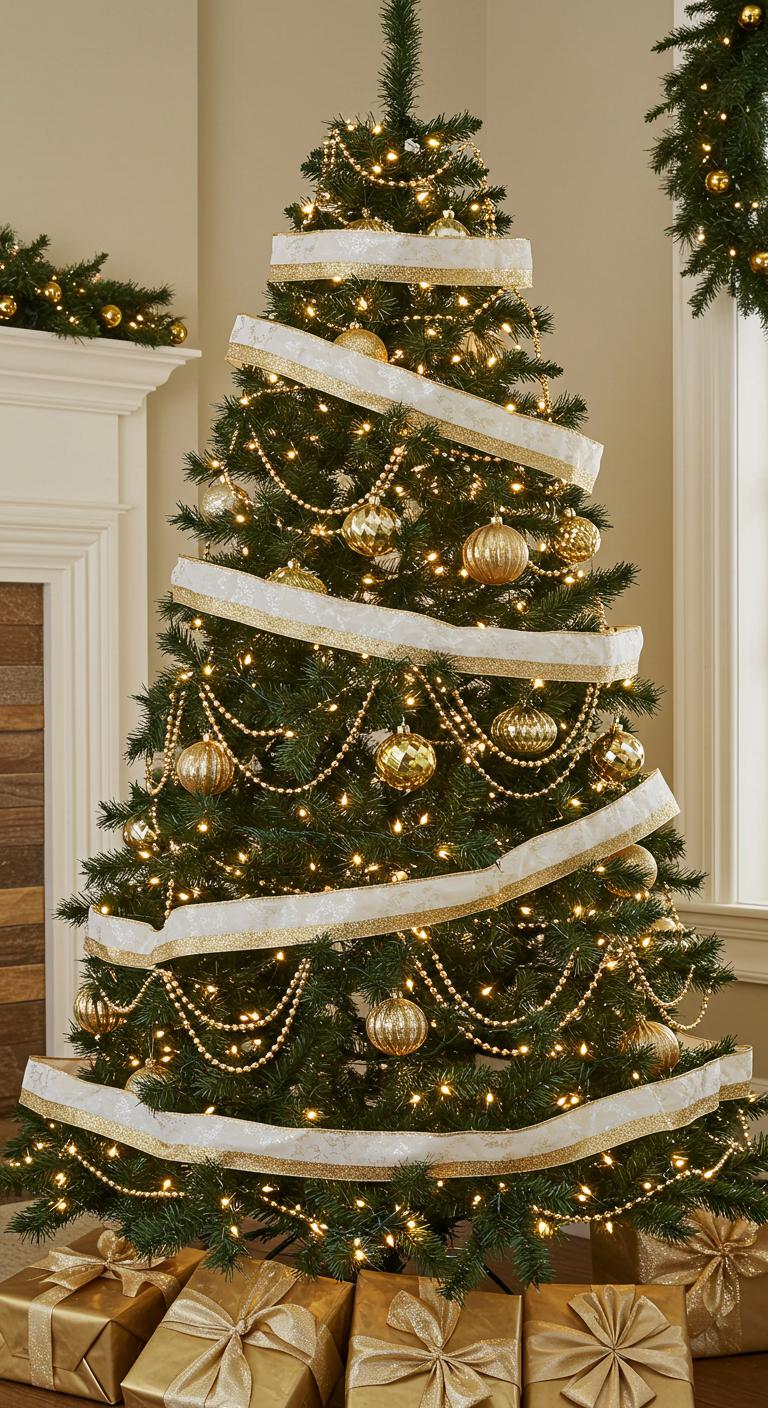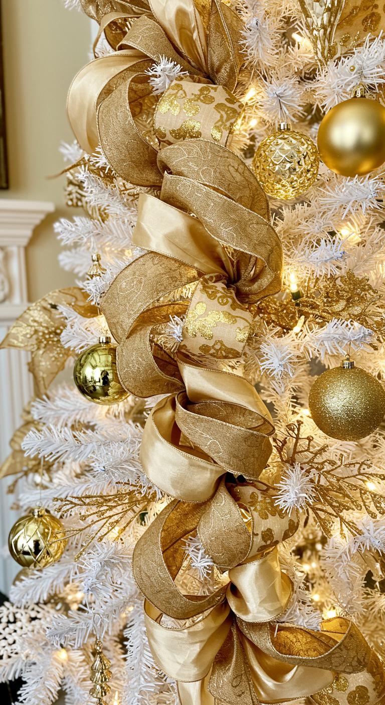 A stunning gold ribbon tree garland can elevate your white and gold Christmas tree to new heights of sophistication.