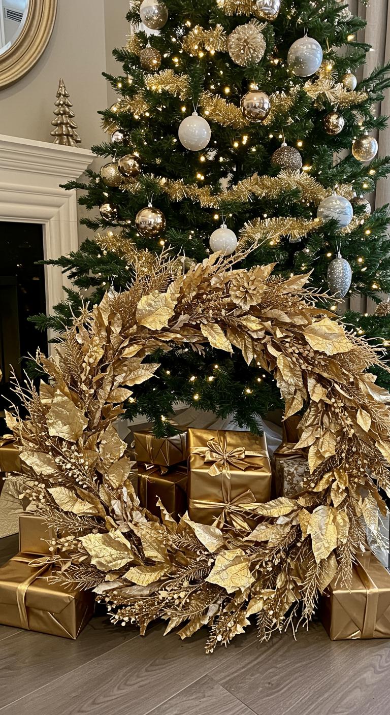 Enhance the base of your Christmas tree with stunning gold leaf wreaths that exude elegance and charm.