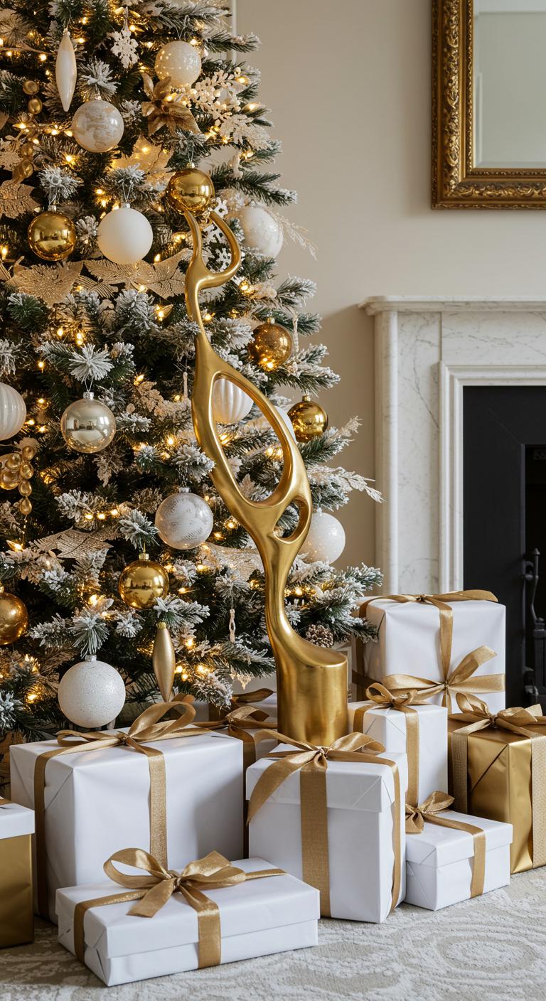 As you arrange your stunning white and gold presents, consider incorporating statement gold art pieces as tree decor to elevate your holiday aesthetic.
