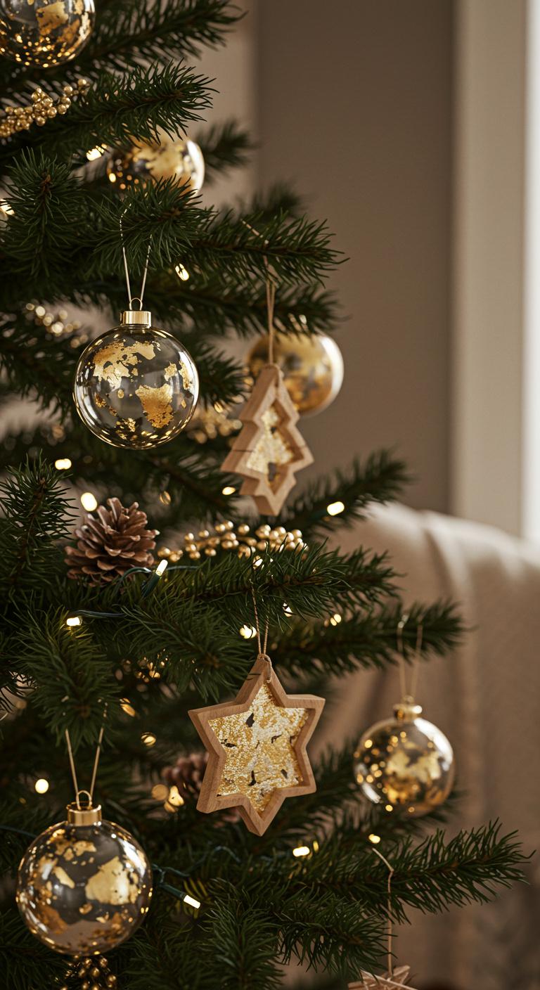 Picture shimmering globes and delicate stars, each adorned with sparkling gold details that catch the light.