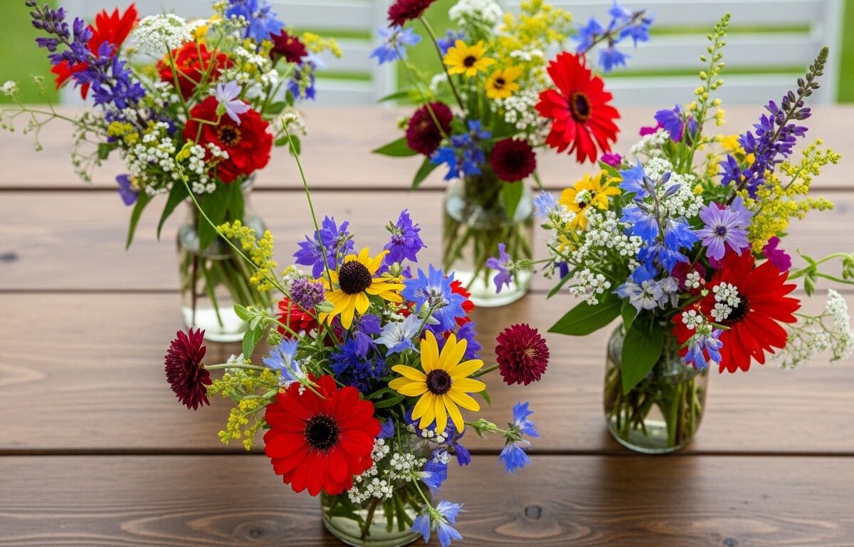 Mismatched vases bursting with every color on a wooden table – it’s like a wildflower party exploded in the best way. You’d love this for outdoor picnics; I set one up for a family BBQ, and it held up through wind and all.