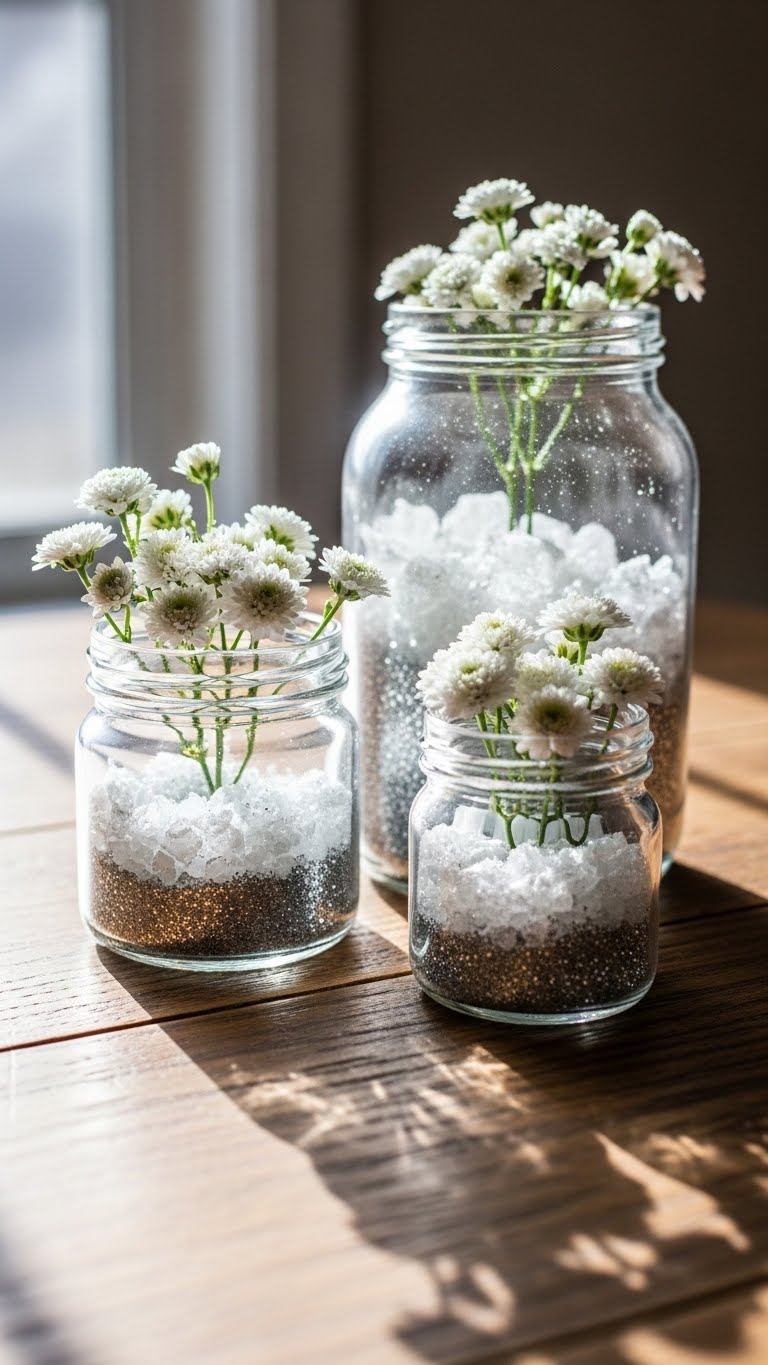 Grab some glitter from your craft box and turn plain vases into winter stars. Start with a clear jar. Add water, a few drops of food coloring for a frosty hue, and mix in loose glitter. Pop in white flowers like those from your garden. This takes minutes and costs almost nothing. Use old jars to save cash. Break it down: First, gather supplies. Next, layer glitter at the bottom. Then, add stems for height. Finish with a ribbon tie. Try this for your coffee table. It adds magic without fuss. Keep it fresh by swapping flowers weekly.