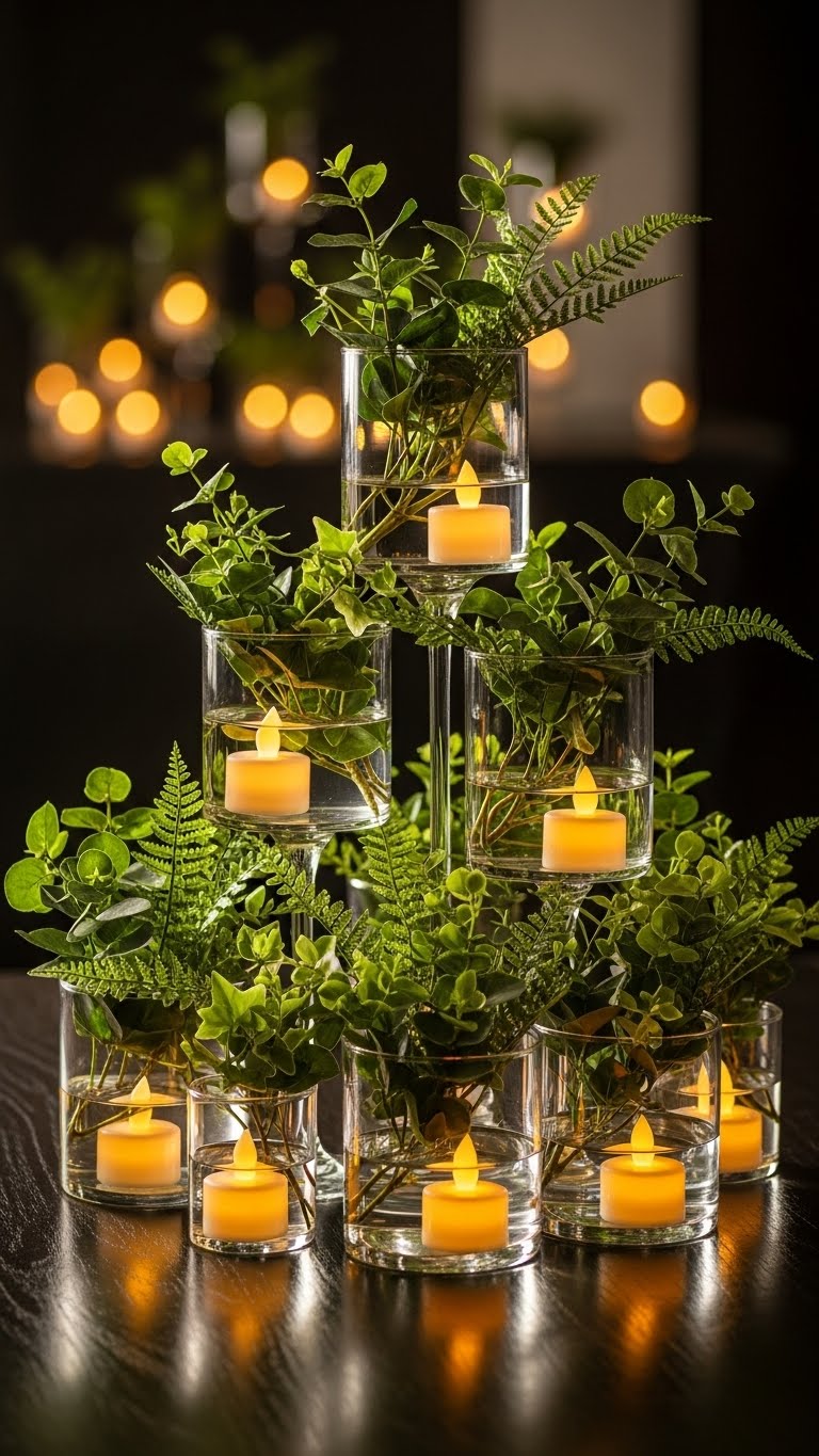 Skip the flowers and go for stacks of vases with lights. Find clear ones at home or a thrift store. Fill the bottom with fake greenery or pine twigs from outside. Tuck in battery tea lights for safe glow. Build layers: Short vase on the base, taller one next. This creates drama fast. Cost tip: Reuse old jars and grab lights for under $5. Do it yourself: Set up in steps. Place the tallest first. Add lights last. Use for dinners to set the mood. It’s quick and adds warmth without wires.