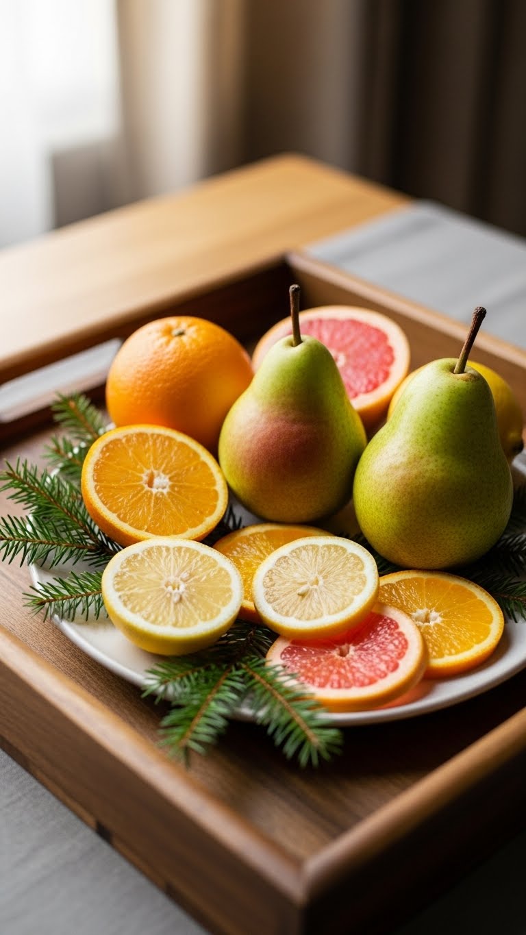 Make your table edible with fruit and greens. Pick pears or oranges from the store. Pair with evergreen bits from your yard. Arrange on a plate or tray. Add a bow for fun. Eat it later to cut waste. Budget hack: Buy seasonal fruit cheap. DIY simple: Slice fruit thin. Lay out greens around it. Stack for height. This works for parties. Try adding it to your dessert spot. It brings color and taste together easily.