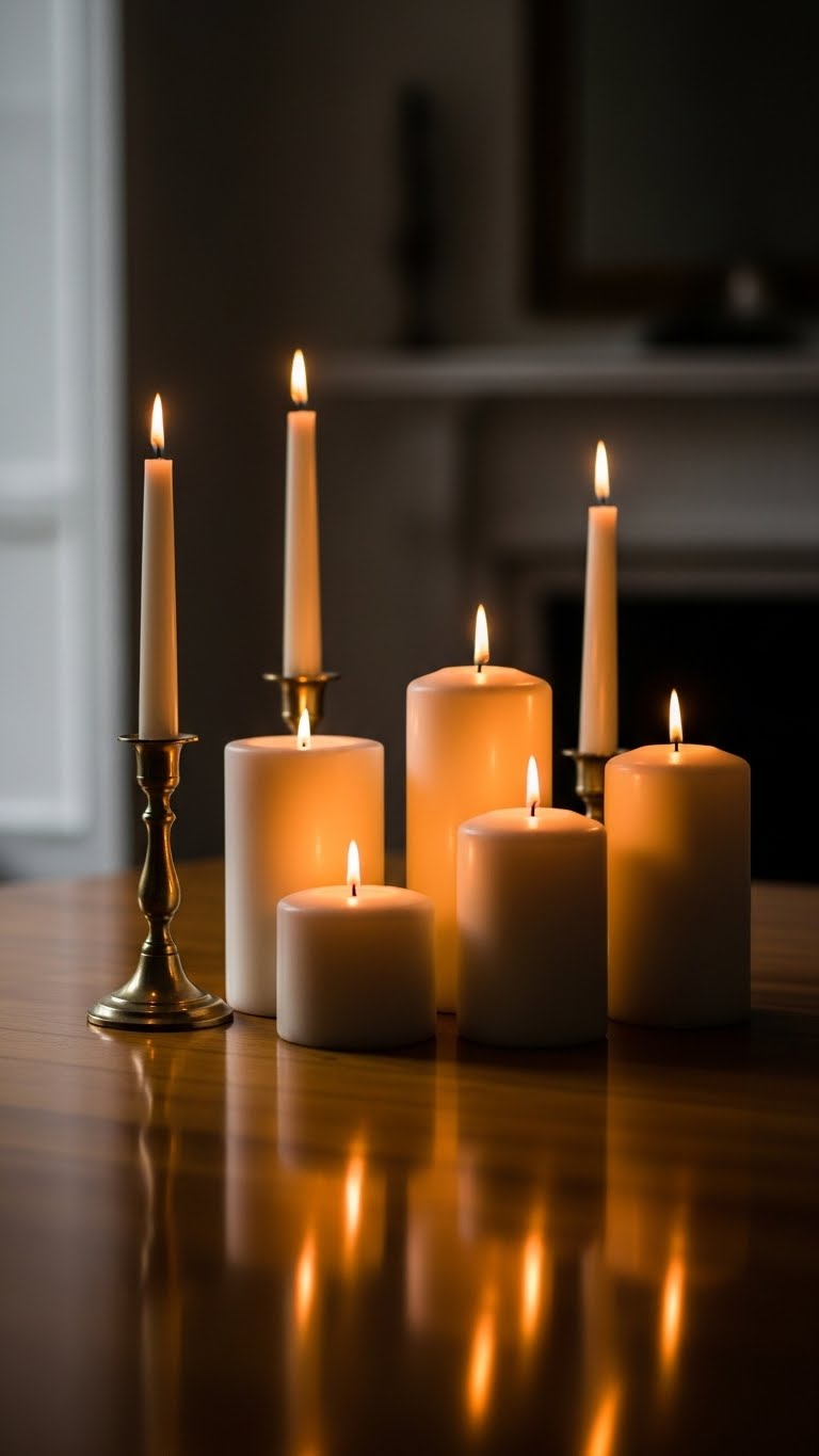 Line up tapers in a row. Light for nights. It creates flow. Budget: Buy in sets. Arrange: Space evenly.
