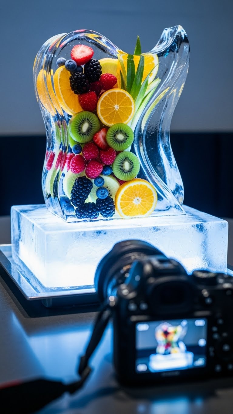 Make ice blocks with fruit frozen in. Use a mold from home. Chill drinks with it. Keep it modern and fun. Cheap: Freeze water yourself. DIY: Add fruit to water. Freeze overnight. Use at parties.