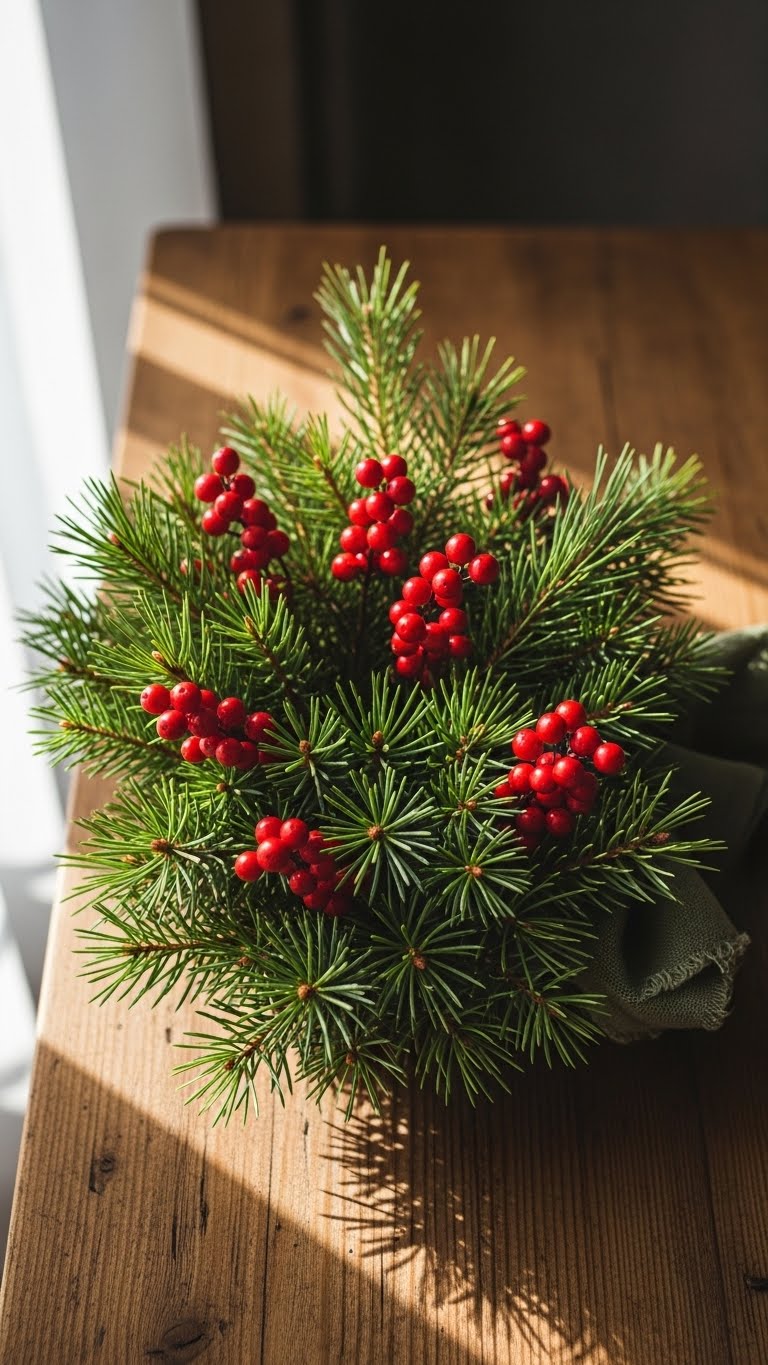 Start with pine from outside. Build around it. Add a few extras. This grounds your look. Free: Gather outdoors. Layer: Add pieces on top.