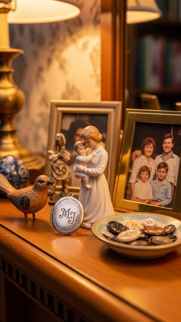 Spotlight old items. Place in the center. Add your story. It’s meaningful. Free: Use family pieces. Arrange: Center them.