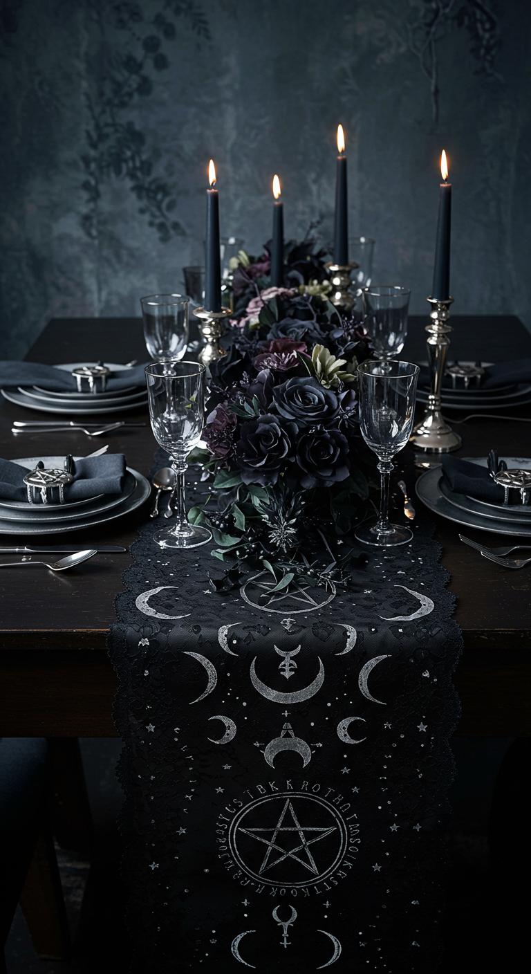 A witchy table runner can enhance your dining setting. Use a dark fabric as a base or lace fabric for a delicate touch. Decorate it with pentacle motifs or stenciled symbols for added flair. If crafting interests you, try sewing fabric scraps into a runner. Add dark floral arrangements along the sides for an elegant effect. This simple addition sets the mood for a magical dinner gathering, combining style with your witchy passions.