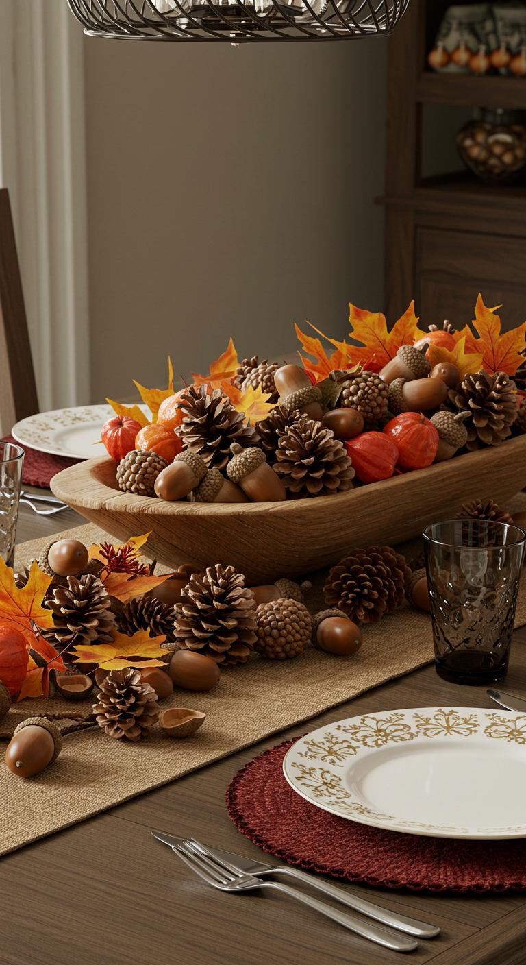 An autumnal centerpiece adds a rich, seasonal feel to your table. Gather pinecones, acorns, and colorful leaves to create an organic arrangement. Place these natural elements in a wooden bowl or dish that radiates rustic charm. To bring in a witchy vibe, incorporate small candles concealed among the decorations. Utilize twigs or branches to give your design height and dimension. This easy and affordable centerpiece creates a warm, welcoming atmosphere, perfect for holiday gatherings.