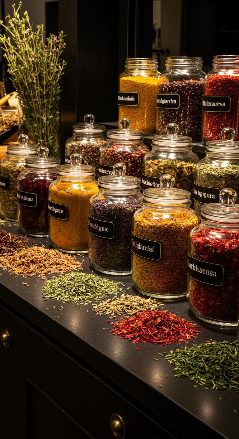 Use a sinister spices display to merge practicality with decor in your kitchen. Use glass jars filled with brightly colored spices like paprika, turmeric, and dried herbs. Label each jar creatively for an elegant touch. Arrange them on a dark wooden tray or shelf for easy access. This budget-friendly decor not only serves a purpose during holiday cooking but also adds a visually appealing element to your witchy holiday theme.