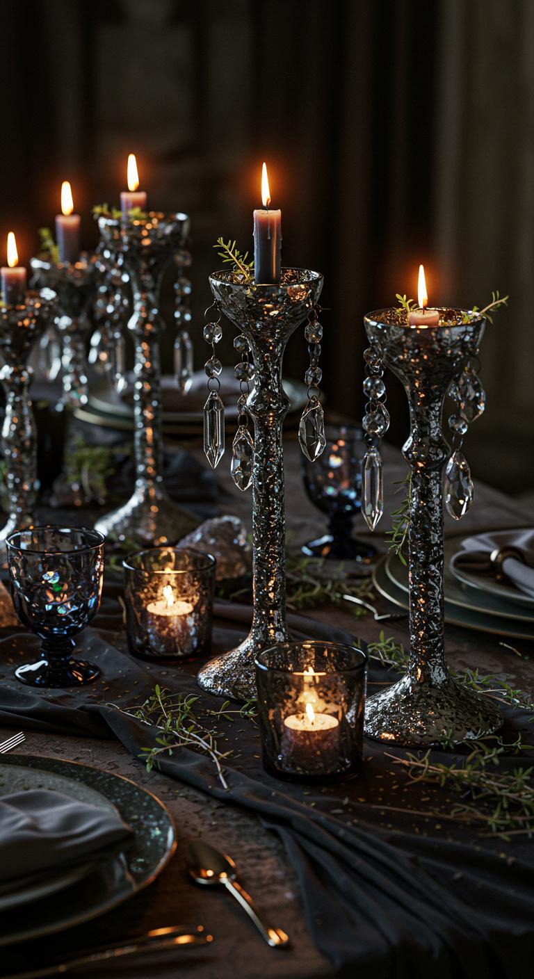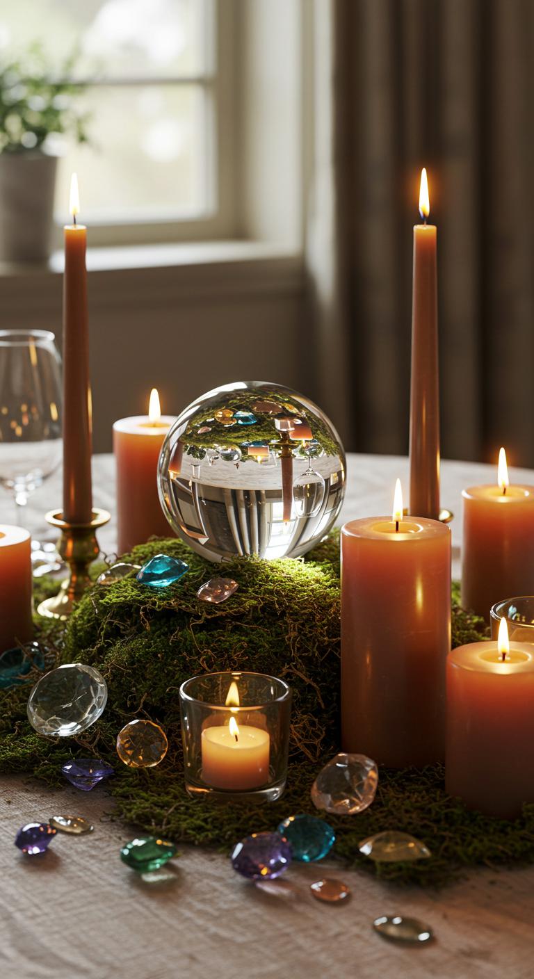 Integrate a crystal ball centerpiece for a striking dinner table look. You can purchase glass balls at craft stores or use glass bowls filled with water as an effective alternative. Surround it with tea lights, gemstones, or small potpourri. Group different sizes for an intriguing display. For a DIY option, paint ordinary glass balls in dark hues or add magical symbols. Keep your arrangement organic with a nature theme—think moss, branches, and evergreen accents. This centerpiece impresses guests and sparks conversation!